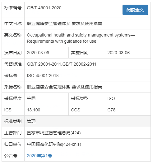 據(jù)國(guó)家標(biāo)準(zhǔn)委官網(wǎng)消息,GB/T 45001-2020《職業(yè)健康安全管理體系—要求及使用指南》正式發(fā)布,于2020年3月6日實(shí)施。