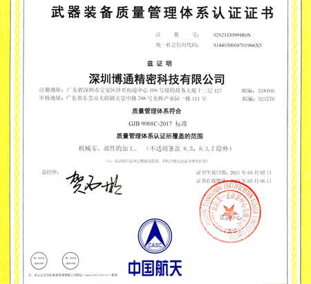 祝深圳博通精密科技有限公司通過GJB 9001C-2017武器裝備與ISO9001兩項(xiàng)質(zhì)量管理體系認(rèn)證