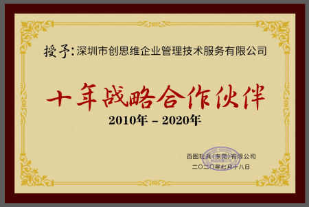 百圖玩具2021年在創思維專業輔導下一次性通過Macy’s梅西驗廠審核,百圖多年來一直與創思維合作通過ICTI驗廠,并授權創思維十年戰略合作伙伴榮譽證書。攜手創思維-合作共贏,未來可期!