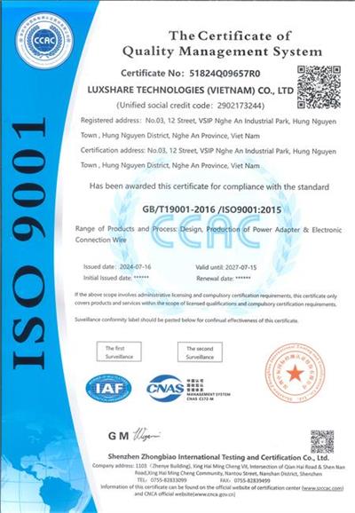 祝賀立訊技術(shù)(越南)有限公司 LUXSHARE TECHNOLOGIES (VIETNAM) CO., LTD 2024年快速通過ISO9001認證